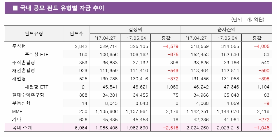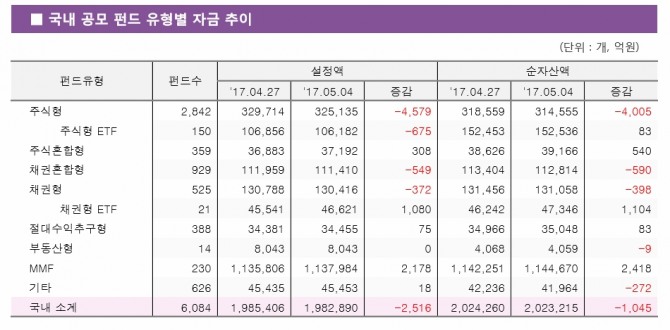 주식형펀드 설정액은 4579억원 감소한 32조5135억원으로 집계됐고, 순자산액은 4005억원 감소한 31조4555억원으로 나타났다.