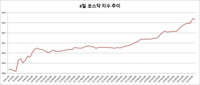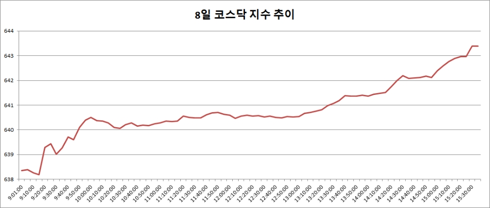 8일 코스닥은 전거래일대비 8.28포인트(1.30%) 오른 643.39로 마감했다.