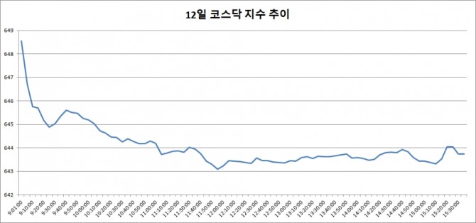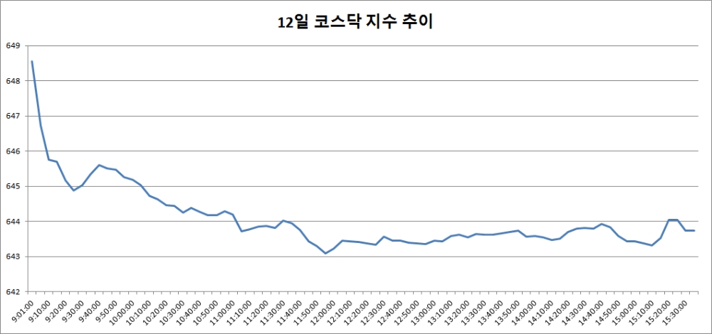 12일 코스닥은 전거래일대비 3.85포인트(0.59%) 떨어진 643.73으로 마감했다. 코스닥은 이날 0.98포인트(0.15%) 오른 648.56으로 출발, 이내 약세로 전환한 뒤 낙폭을 키웠다. 다만 주간기준으로는 1.36% 올라 전주(1.09%)에 이어 2주 연속 상승했다.