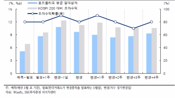 이창환 IBK투자증권 연구원은 "발표시점 이전에 진입하는 것이 나은 성과를 보였다”라며 “변경 이후 시간이 1개월 이상 보유할 경우 성과가 급격히 하락하는데 이때를 지수변경 이벤트 전략의 실효성이 소멸되는 시점이라고 볼 수 있다”고 말했다.