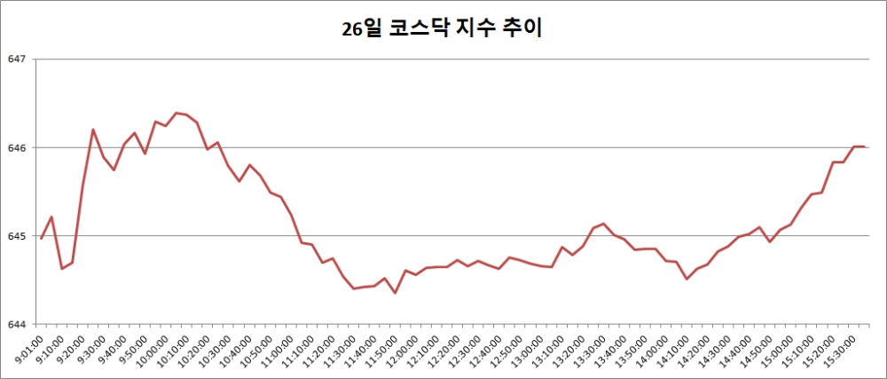 26일 코스닥은 전거래일대비 2.99포인트(0.46%) 오른 646.01로 마감했다.