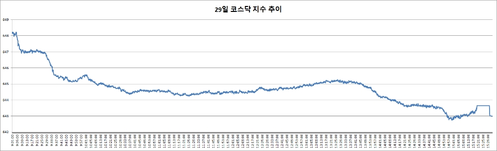 29일 코스닥은 전거래일대비 3.03포인트(0.47%) 내린 642.98로 마감했다. 코스닥은 이날 상승세로 출발했으나 오전 9시34분에 하락세로 전환(-0.04%), 내내 약세를 유지했다.