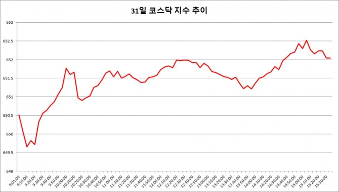 31일 코스닥은 전거래일대비 2.98포인트(0.46%) 오른 652.04로 마감했다. 코스닥이 종가 기준으로 650선을 기록한 것은 지난해 10월21일(651.77) 이후 150거래일만에 처음이다.