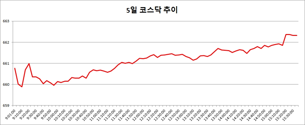 5일 코스닥은 전거래일대비 3.54포인트(0.54%) 오른 662.32로 마감했다. 코스닥이 종가 기준으로 660선에 마감한 것은 지난해 10월19일(661.26) 이후 처음이다.