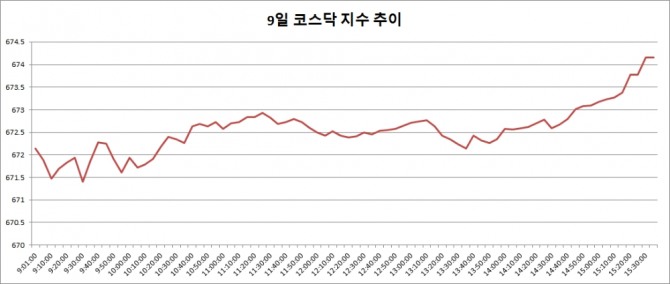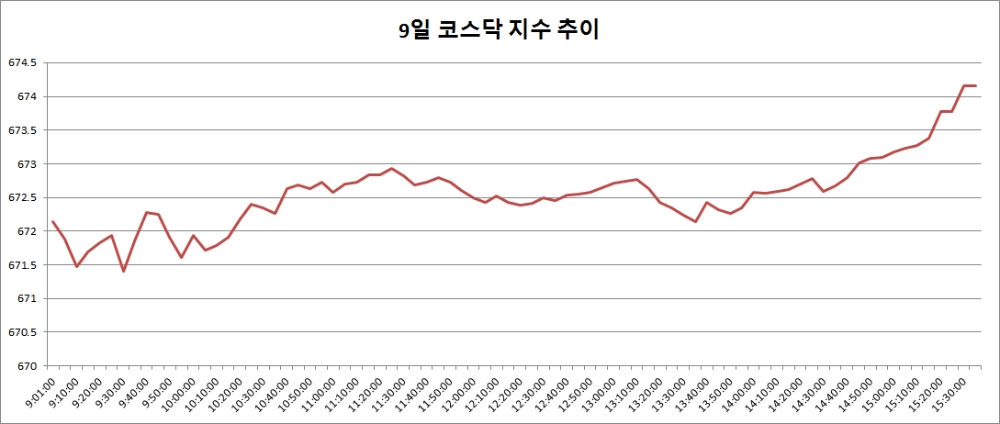 9일 코스닥은 전거래일대비 4.18포인트(0.62%) 오른 674.15로 마감했다. 코스닥이 종가 기준으로 670선을 회복한 것은 지난해 10월11일(670.64) 이후 처음이다.