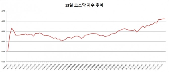 13일 코스닥은 전거래일대비 4.37포인트(0.66%) 오른 669.23으로 마감했다.