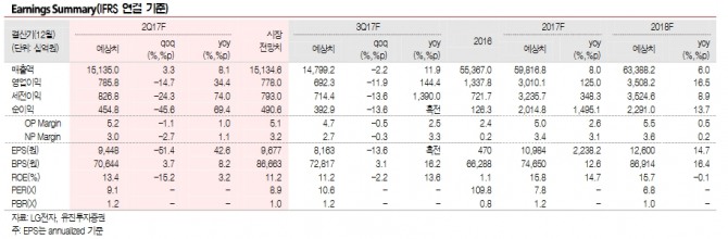 노 연구원은 "LCD 패널 가격 상승에도 불구하고 OLED TV와 대면적 UHD 판매량 확대로 수익성과 시장지배력은 더욱 견고해질 것으로 확신한다"며 "계속된 사업구조 개선과 중저가 스마트폰 역량 강화에 따라 MC사업부의 손익은 점차 안정화 단계에 접어들고 있다"고 말했다.