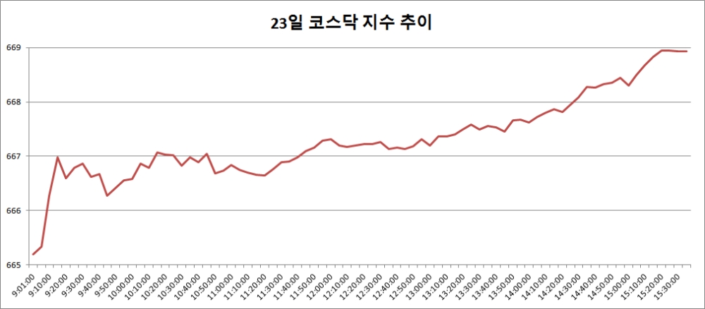 이미지 확대보기23일 코스닥은 전거래일대비 5.65포인트(0.85%) 오른 668.93으로 마감했다. 전일대비 1.91포인트 오른채 출발한 코스닥은 이날 점차 상승폭을 높여가다 장을 마쳤다.