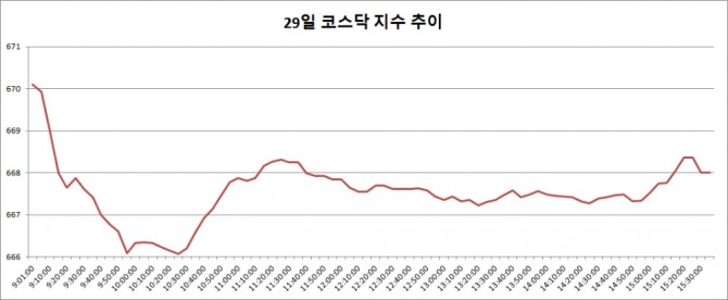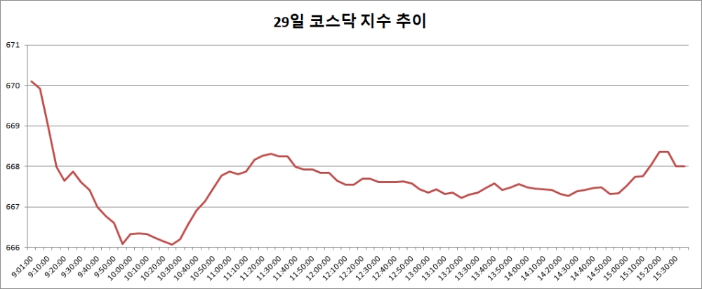이미지 확대보기29일 코스닥은 전거래일대비 2.11포인트(0.32%) 오른 668로 장을 마쳤다.