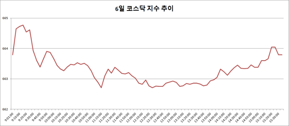 이미지 확대보기6일 코스닥은 전거래일대비 2.25포인트(0.34%) 오른 663.79로 마감했다. 전날(0.82%)에 이어 이틀 연속 상승세다.