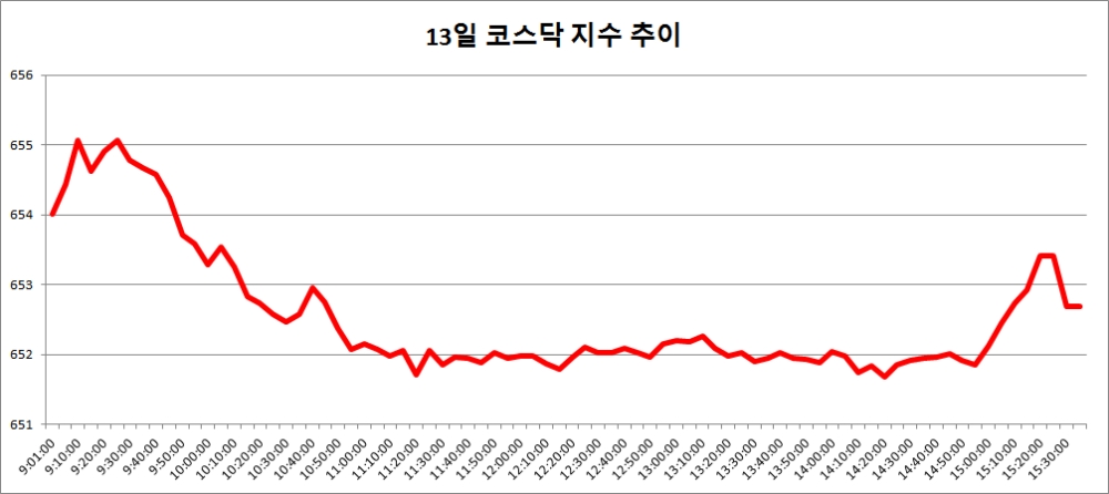 13일 코스닥은 전거래일대비 1.59포인트(0.24%) 오른 652.69로 마감했다. 지난 6일 이후 5거래일만의 반등이다.