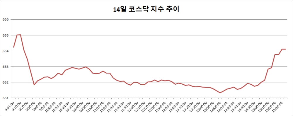 이미지 확대보기14일 코스닥은 전거래일대비 1.42포인트(0.22%) 오른 654.11로 마감했다. 코스닥은 이날 전일대비 1.55포인트(0.24%0 오른 654.24로 출발, 차츰 상승폭을 높이다 오전에 하락세로 돌아섰다. 이후 등락을 거듭하던 코스닥은 장 막판 반등에 성공했다