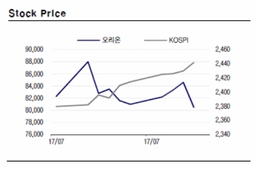 송치호 이베스트투자증권 연구원은 "3분기 중국 매출 성장은 시장 우려 대비 빠른 매대 회복으로 기존 당사 추정치 YoY -18.0% 보다 빠른 YoY -10% 수준까지 빨라질 수 있다”며 “과거 오리온 주가의 핵심요인은 매출 성장성으로 매출 성장 회복 속도에 따라 주가 회복 속도 빨라질 가능성도 존재한다”고 말했다..