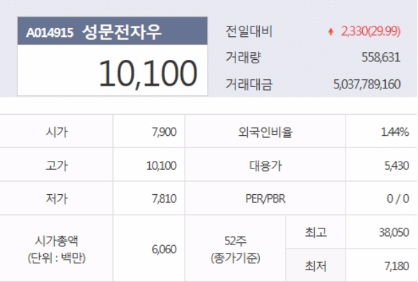 성문전자 2690원 29.95%,성문전자우 1만100원 29.99%로 가격제한폭까지 올랐다.