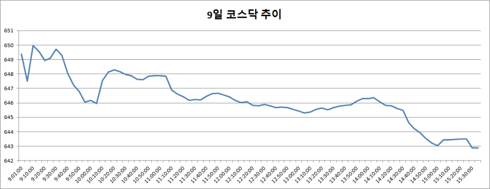 이미지 확대보기9일 코스닥은 전거래일 대비 8.80포인트(1.35%) 내린 642.87로 마감했다. 전날 650선을 회복한 지 하루 만에 다시 640선으로 물러났다.