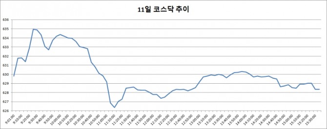 이미지 확대보기11일 코스닥은 전거래일대비 11.70포인트(1.83%) 내린 628.34로 마감했다. 지난 9일부터 3거래일 연속 내림세를 보이며 620선대로 물러났다.