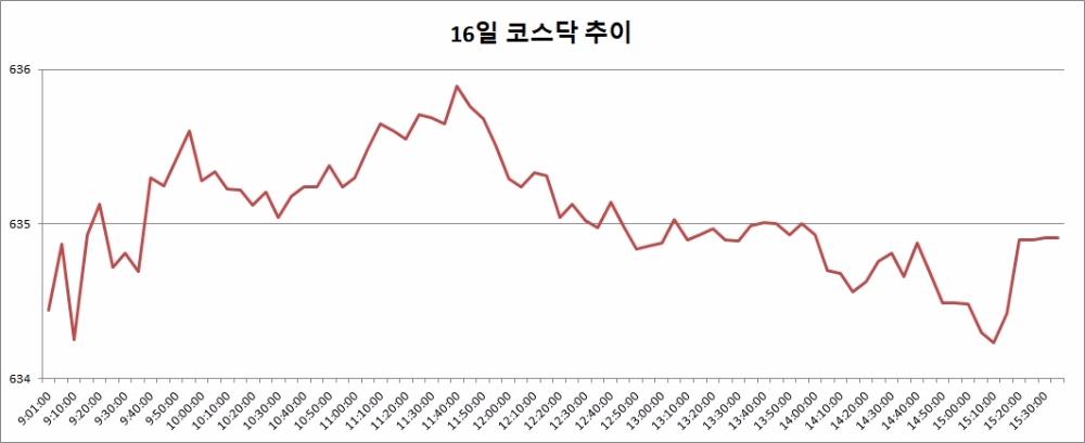16일 코스닥은 전거래일대비 5.54포인트(0.88%) 오른 634.91로 마감했다. 전거래일(14일)에 이어 이틀 연속 오름세다.