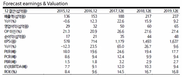 이에 따라 2017년 매출액은 1876억원(+22.6%YoY), 영업이익은 503억원(+55.7%YoY, opm26.8%)으로 전망된다.