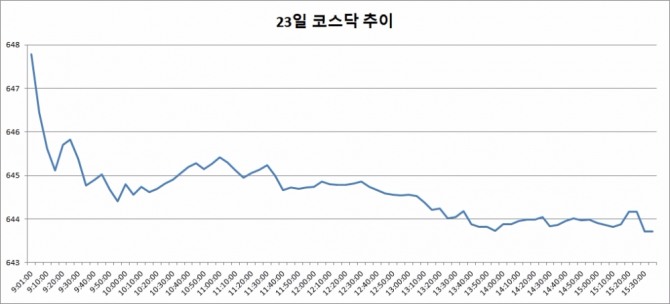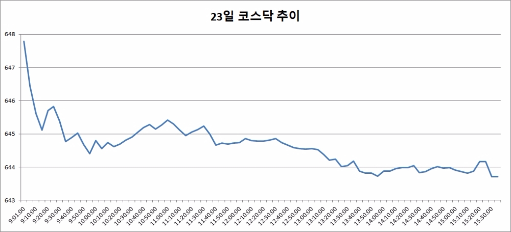 이미지 확대보기23일 코스닥은 전거래일대비 0.55포인트(-0.09%) 내린 643.71로 마감했다. 코스닥은 이날 전거래일대비3.53포인트(0.55%) 오른 647.79로 출발했다. 차츰 상승폭을 줄인 코스닥은 오후 들어 약세로 반전, 그대로 장을 마쳤다.