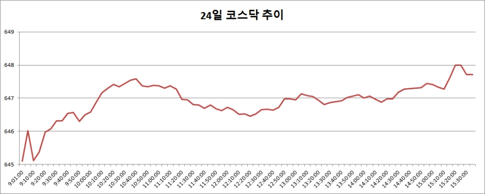 이미지 확대보기24일 코스닥은 전거래일대비 4.00포인트(0.62%) 오른 647.71로 마감했다. 코스닥은 이날 전거래일대비 1.39포인트(0.22%) 오른 645.10으로 출발, 오후 들어 상승폭을 키우며 장을 마쳤다.