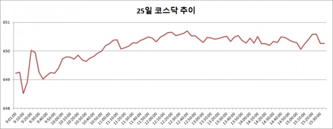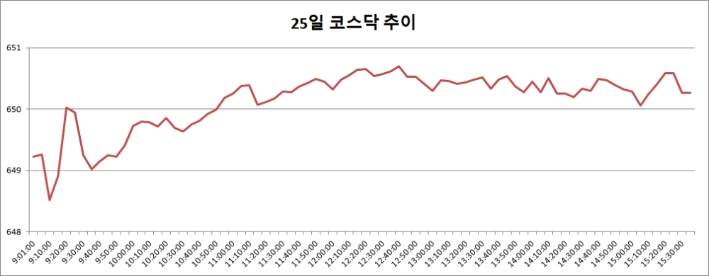25일 코스닥은 전거래일대비 2.56포인트(0.40%) 오른 650.27로 마감했다. 코스닥은 이날 전일대비 1.51포인트(0.23%) 오른 649.22로 출발, 점차 상승폭을 키워가며 650선 회복에 성공했다. 코스닥이 종가기준으로 650선을 회복한 것은 지난 8일(651.67) 이후 12거래일 만이다.