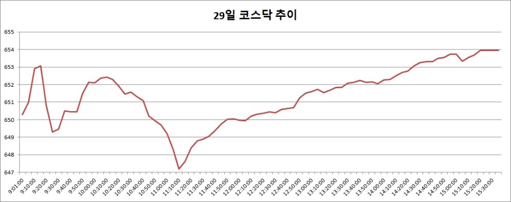 이미지 확대보기29일 코스닥은 전거래일대비 1.04포인트(0.16%) 오른 653.96으로 마감했다. 코스닥은 이날 전거래일대비 2.64포인트(0.40%) 내린 650.28로 출발, 장중 647.13까지 떨어지기도 했으나 오후 들어 상승반전에 성공, 650선을 지켜냈다.