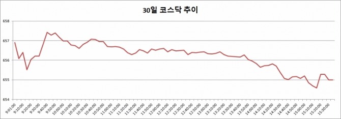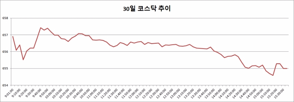 이미지 확대보기30일 코스닥은 전거래일대비 1.04포인트(0.16%) 오른 655.00으로 마감했다. 이날 코스닥은 전거래일대비 2.94포인트(0.45%) 오른 656.90으로 출발, 오후 들어 상승폭을 조금 낮추긴 했으나 견조한 모습으로 장을 마쳤다.