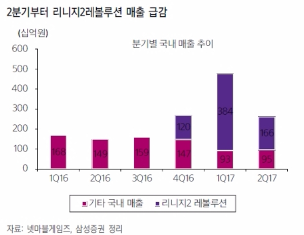 이경일 흥국증권 연구원은 “2H17 기대 신작들에 의한 실적개선 가능성은 유효하나 상장 초기부터 다양한 모멘텀들이 너무 과도한 시점에 선반영되며 글로벌 Peers(동종 업체) 대비 높은 밸류에이션을 받았다”며 “리니지2 레볼루션의 기록적인 흥행으로 신작 라인업에 대한 Hit-ratio(적중률)를 과대평가한 착시효과에 기인한다”고 분석했다.