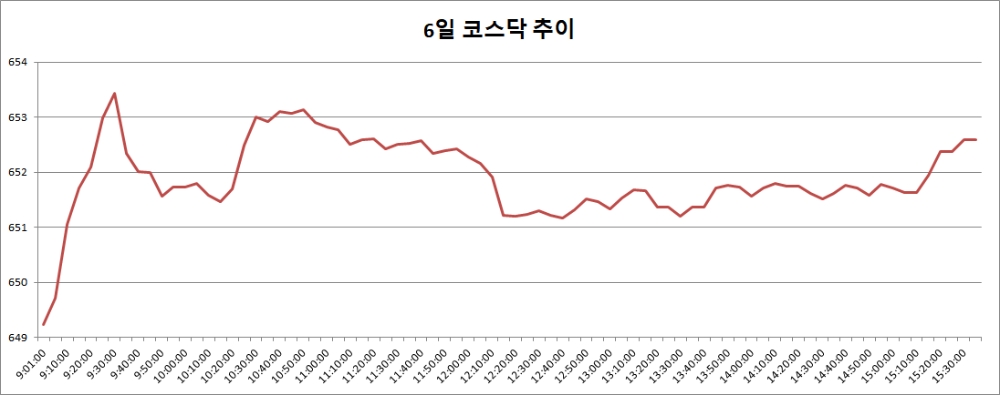 이미지 확대보기6일 코스닥은 전거래일대비 3.84포인트(0.59%) 오른 652.59로 마감했다. 코스닥은 이날 전거래일대비 0.48포인트(0.07%) 오른 649.23으로 출발, 이후 상승폭을 키우며 장중 653.44까지 오르기도 했다.