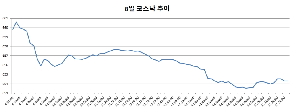 8일 코스닥은 전거래일대비 4.19포인트(-0.64%) 내린 654.29로 마감했다. 코스닥은 이날 전 거래일대비 1.35포인트(0.21%) 오른 659.83으로 출발했다. 장 초반 660선 위로 올라서기도 했으나 이후 상승폭을 좁히다 하락 반전, 650선 초반대로 장을 마쳤다.