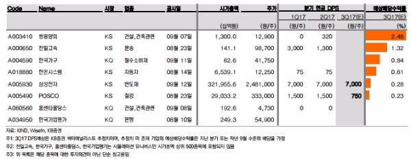 최연구원은 또 "9월의 경우 분기별 균등 배당을 실시하고 있는 4개 종목(삼성전자, POSCO, 코웨이, 한온시스템) 정도가 배당을 할 것으로 예상된다”며 전반적으로 올해 9월 분기배당은 큰 이슈없이 넘어갈 것”이라고 내다봤다.