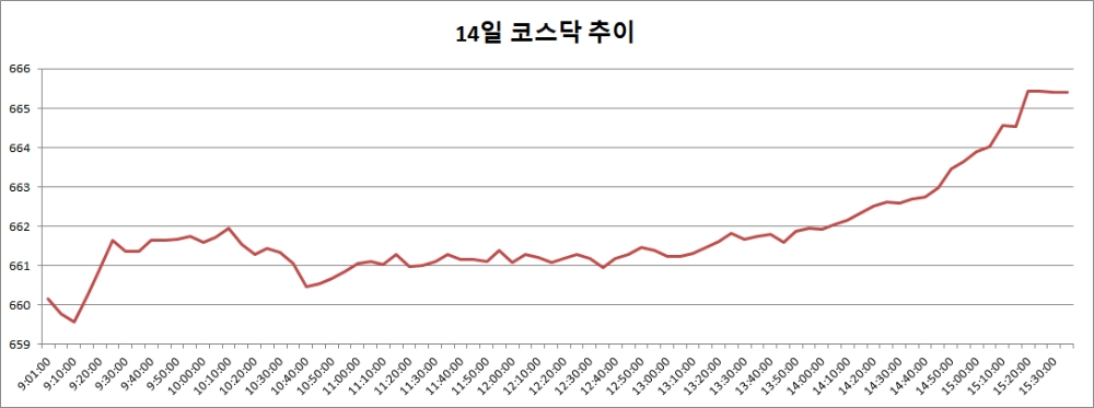 이미지 확대보기15일 코스닥은 전거래일대비 5.89포인트(0.89%) 오른 671.30으로 마감했다. 북한이 이날 오전 미사일을 발사한 영향으로 코스닥은 2.51포인트(-0.38%) 내린 662.90으로 출발했다. 이후 상승 반전에 성공, 오후 들어 상승폭을 키우며 670선을 회복하는데 성공했다.