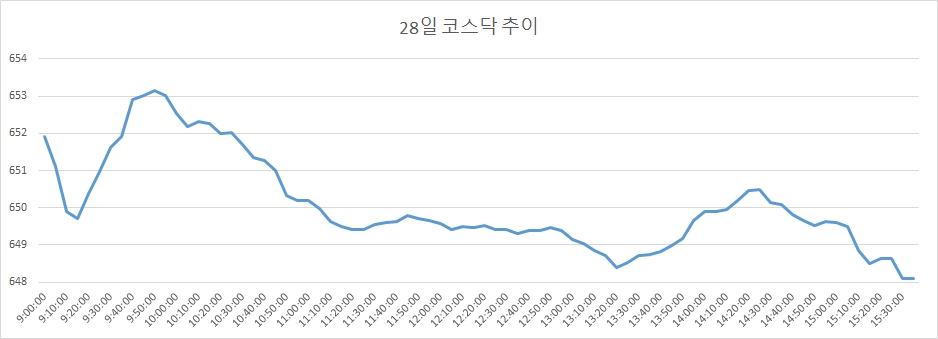 28일 코스닥은 전거래일대비 1.15포인트(-0.18%) 내린 648.09로 마감했다.