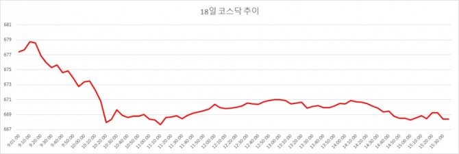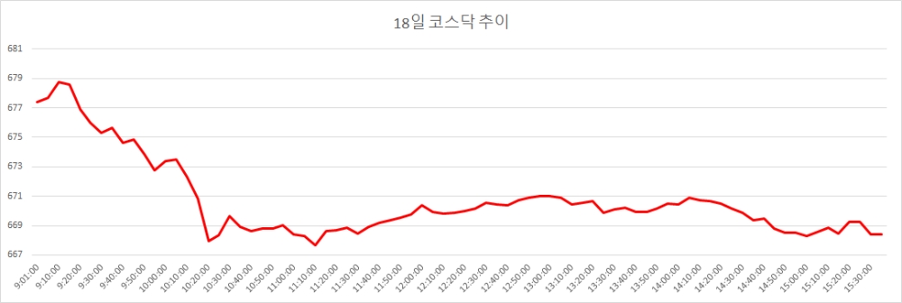 18일 코스닥은 전거래일대비 2.09포인트(-0.31%) 내린 668.42로 마감했다. 코스닥은 이날 6.91포인트(1.03%) 오른 677.42로 출발했다. 오전 중 하락전환한 코스닥은 등락을 거듭하다 오후 들어 하락으로 방향을 굳혔다.