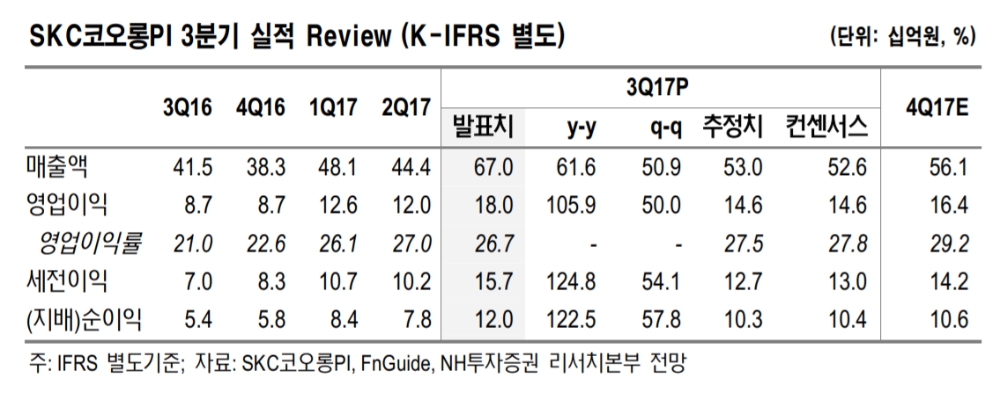 SKC코오롱PI의 3분기 매출액은 670억원(전년대비 +61.6%), 영업이익 180억원(+105.9%을 기록했다. 이는 시장컨센서스(매출액 526억원, 영업이익 146억원)를 넘어서는 사상최대 분기 실적이다.
