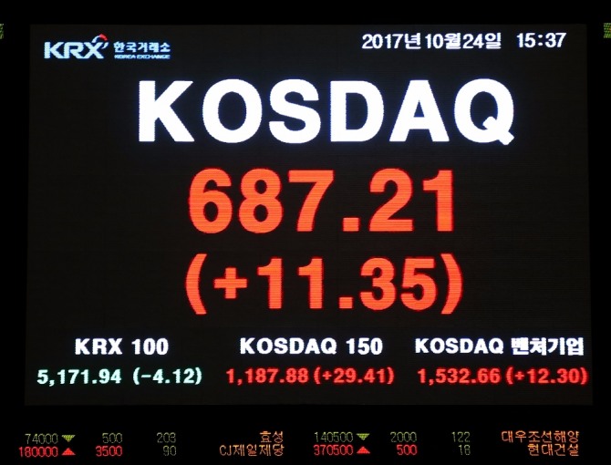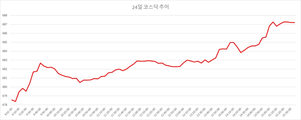 이미지 확대보기24일 코스닥은 전거래일대비 11.35포인트(1.68%) 오른 687.21로 마감했다. 코스닥은 이날 2.69포인트(0.40%) 오른 678.55로 출발했다. 오후 들어 외인과 기관의 매수가 강해지며 지수는 강세로 마감했다.
