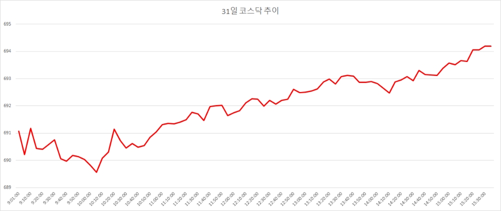 31일 코스닥은 전거래일대비 4.52포인트(0.66%) 오른 694.20으로 마감했다. 코스닥은 이날 1.39포인트(0.20%) 오른 691.07로 출발했다. 장 초반 잠시 흔들리기도 했으나 이후 상승으로 방향을 잡았다.