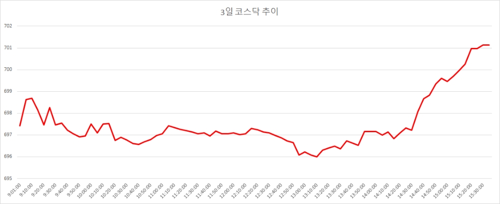 3일 코스닥은 전거래일대비 6.17포인트(0.89%) 오른 701.13으로 마감했다. 코스닥이 종가 기준으로 700을 넘긴 것은 지난해 8월12일(705.18) 이후 처음이다.