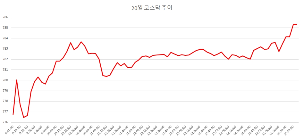 이미지 확대보기20일 코스닥은 전거래일대비 9.47포인트(1.22%) 오른 785.32로 마감했다. 코스닥은 이날 0.89포인트(0.11%) 오른 776.74로 출발했다. 이후 점차 상승폭을 키우며 지난 16일 기록한 연중 최고가(780.22)를 다시 한번 갈아치웠다.