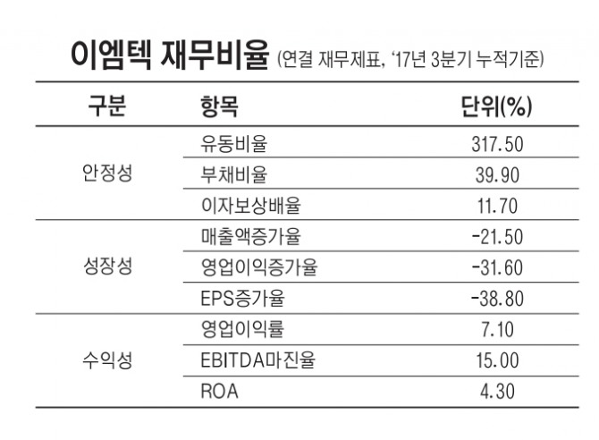 이엠텍의 연결기준으로 이 회사의 지불능력을 판단하는 지표인 유동비율은 3분기 말 기준 317.5%다. 유동비율이 높을수록 기업의 재무유동성은 크다. 통상 200% 이상으로 유지되는 것이 이상적이라 본다. 2분기 말 기준으로 이엠텍의 유동자산은 918억원, 유동부채는 289억원이다.
