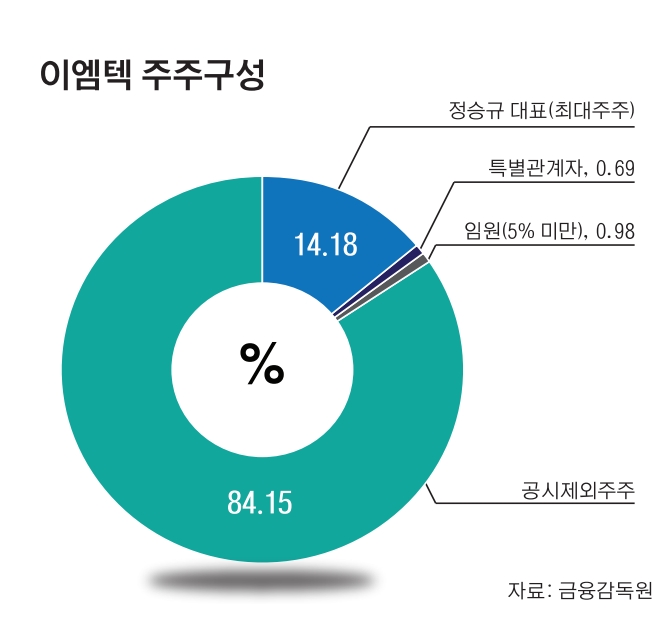 이엠텍은 지난 2007년 5월 코스닥에 상장했다. 상장 당시 최대 주주는 황상문 부산대 교수와 LG전자 연구소 출신인 정승규 씨다. 두 사람이 공동대표를 맡고 있었으나 황 대표는 차츰 지분을 축소했다. 지난 2011년 두 사람의 지분 거래를 통해 최대 주주가 정승규 대표 단독 체제로 전환됐다.