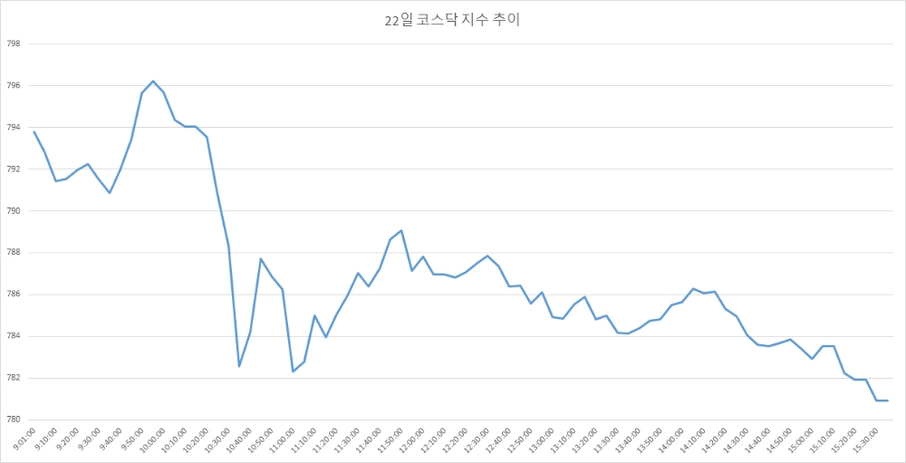 22일 코스닥은 전거래일대비 8.48포인트(-1.07%) 내린 780.90으로 마감했다. 코스닥은 이날 4.41포인트(0.56%) 오른 793.79로 출발했다. 장 초반 797.28을 기록, 연중 최고점을 갈아치운 코스닥은 이후 상승폭을 줄이다 하락반전했다.