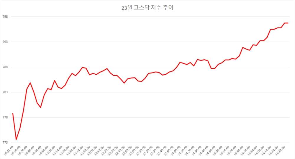 23일 코스닥은 전거래일대비 15.90포인트(2.04%) 오른 796.80으로 마감했다. 수능으로 평시보다 한시간 늦게 개장 하고 마감도 늦춘 코스닥은 이날 2.06포인트(-0.26%) 내린 778.84로 출발했다. 장 초반 상승반전에 성공한 뒤 오후 들어 차츰 상승폭을 키우다 장을 마쳤다.
