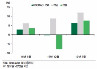 DB금융투자에 따르면 지난해 상반기 10개의 구성종목교체시 편입예정 종목 가운데 7개가 코스닥150대비 아웃퍼폼했다. 12월에는 12개 중 10개 종목이, 올해 6월에는 13개 종목 중 9개 종목이 코스닥150보다 높은 수익률을 기록했다. .