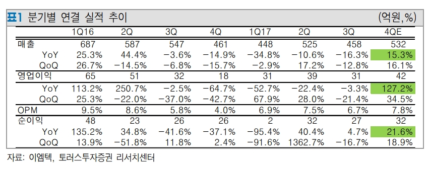 전 연구원은 "수익성이 높은 전자담배 릴이 올 4분기 약 14만대, 내년에는 약 100만대가 판매될 것으로 토러스투자증권은 예상하고 있다"며 "이엠텍의 올해 4분기 예상 연결 매출과 영업이익은 전년동기대비 각각 15.3%, 127.2%의 큰 폭 성장이 전망된다"고 덧붙였다.