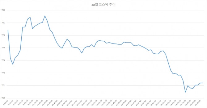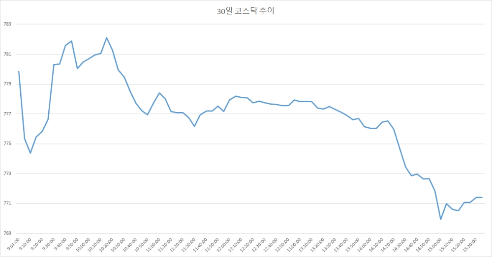 30일 코스닥은 전거래일대비 10.30포인트(-1.32%) 내린 771.42로 마감했다.