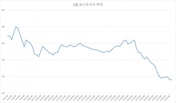 코스닥은 이날 3.75포인트(0.50%) 오른 757.21로 출발했다. 장 초반 760선을 회복(760.73)하기도 했으나 이후등락을 거듭하다 오후 들어 급락세를 나타내며 740선대로 떨어졌다.