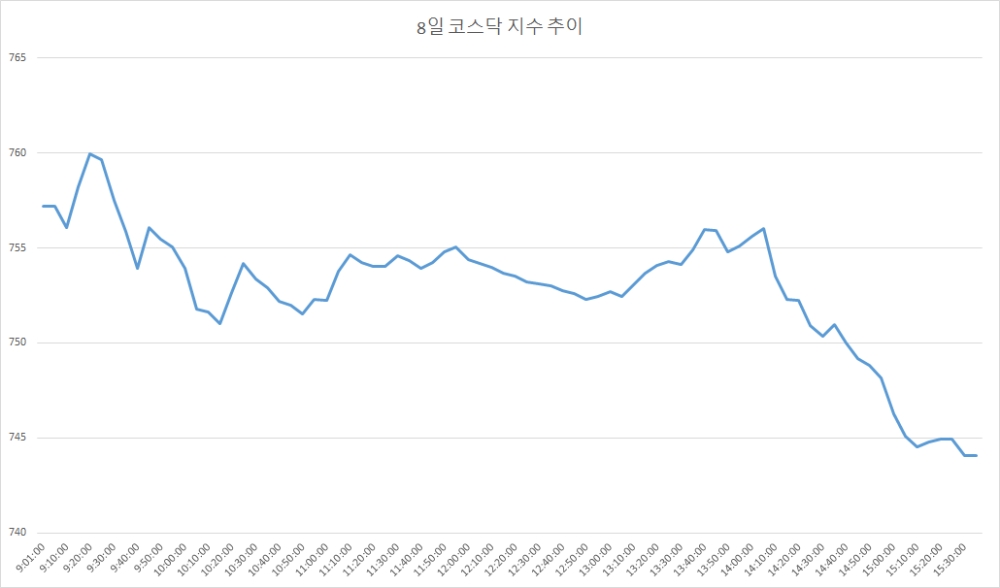 8일 코스닥은 전거래일대비 9.40포인트(-1.25%) 내린 744.06으로 마감했다. 지난 4일부터 5거래일 연속 하락이다. 이에 따라 코스닥은 한주간 총 43.64포인트(-5.54%) 내렸다.