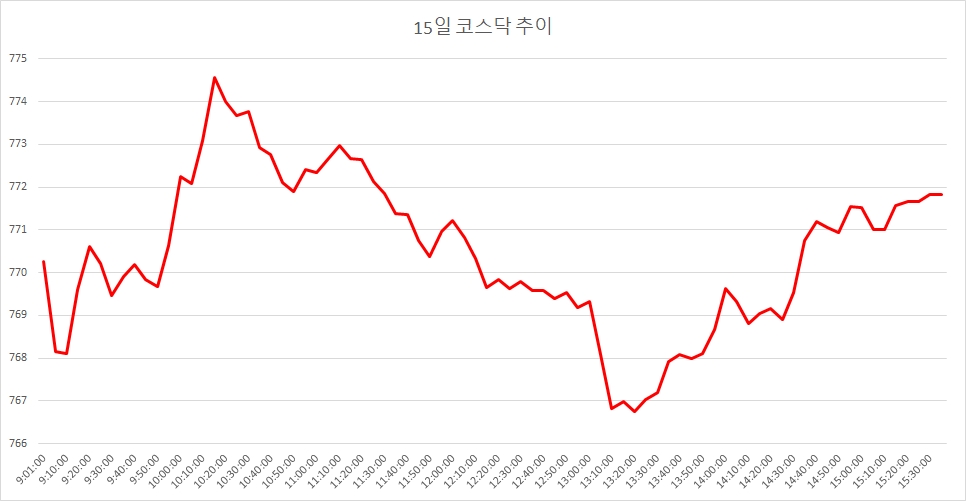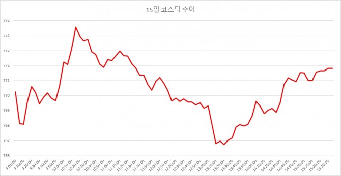 15일 코스닥은 전거래일대비 1.47포인트(0.19%) 오른 771.82로 마감했다. 이에 따라 코스닥은 주간 기준으로 3주만에 상승(+27.36포인트, 3.73%) 마감했다.