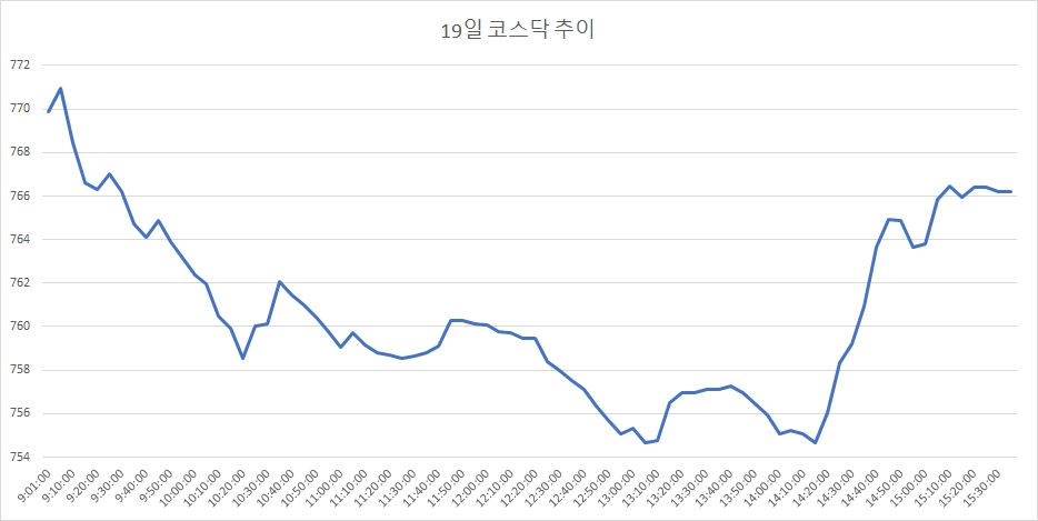 19일 코스닥은 전거래일대비 4.32포인트(-0.56%) 내린 766.18로 마감했다. 코스닥은 이날 0.63포인트(-0.08%) 하락한 769.87로 출발했다. 장 초반 잠시 반등하며 770선을 회복(771.01)하기도 했으나 이후 급락했다. 코스닥은 이날 장중 750선(754.27)까지 내려가기도 했으나 장 막판 낙폭을 줄이며 760선대에서 장을 마쳤다.